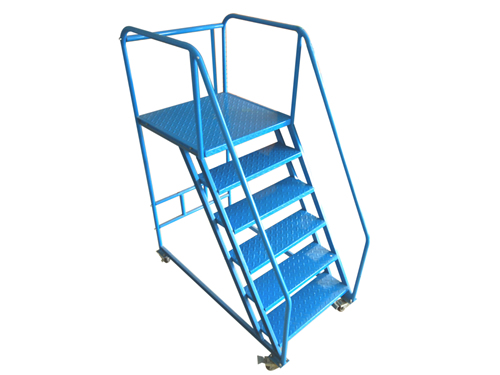 登高車的一側(cè)設(shè)有臺階(臺階旁有扶手)供用戶登上平臺,平臺的另一側(cè)則裝有護(hù)欄以確保操作員的安全。平臺的一般工作表面可容納1-2人站立、轉(zhuǎn)、移動。用戶可以完成在上升車的平臺上從貨架的高度堆疊物品的動作。另外,登高車還配備有腳輪,方便用戶推拉移動。其中,前腳輪裝有車輪制動器。制動后,上升的車輛被固定并且不能移動,并且使用者可以安全地上升操作。